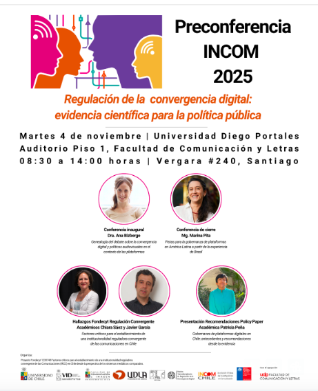 la preconferencia “Regulación de la convergencia digital: evidencia científica para la política pública”, es una instancia que busca abrir un diálogo especializado sobre los desafíos regulatorios del ecosistema digital desde la evidencia académica y las políticas públicas. la actividad se desarrollará en el Auditorio de la Facultad de Comunicación y Letras de la Universidad Diego Portales.