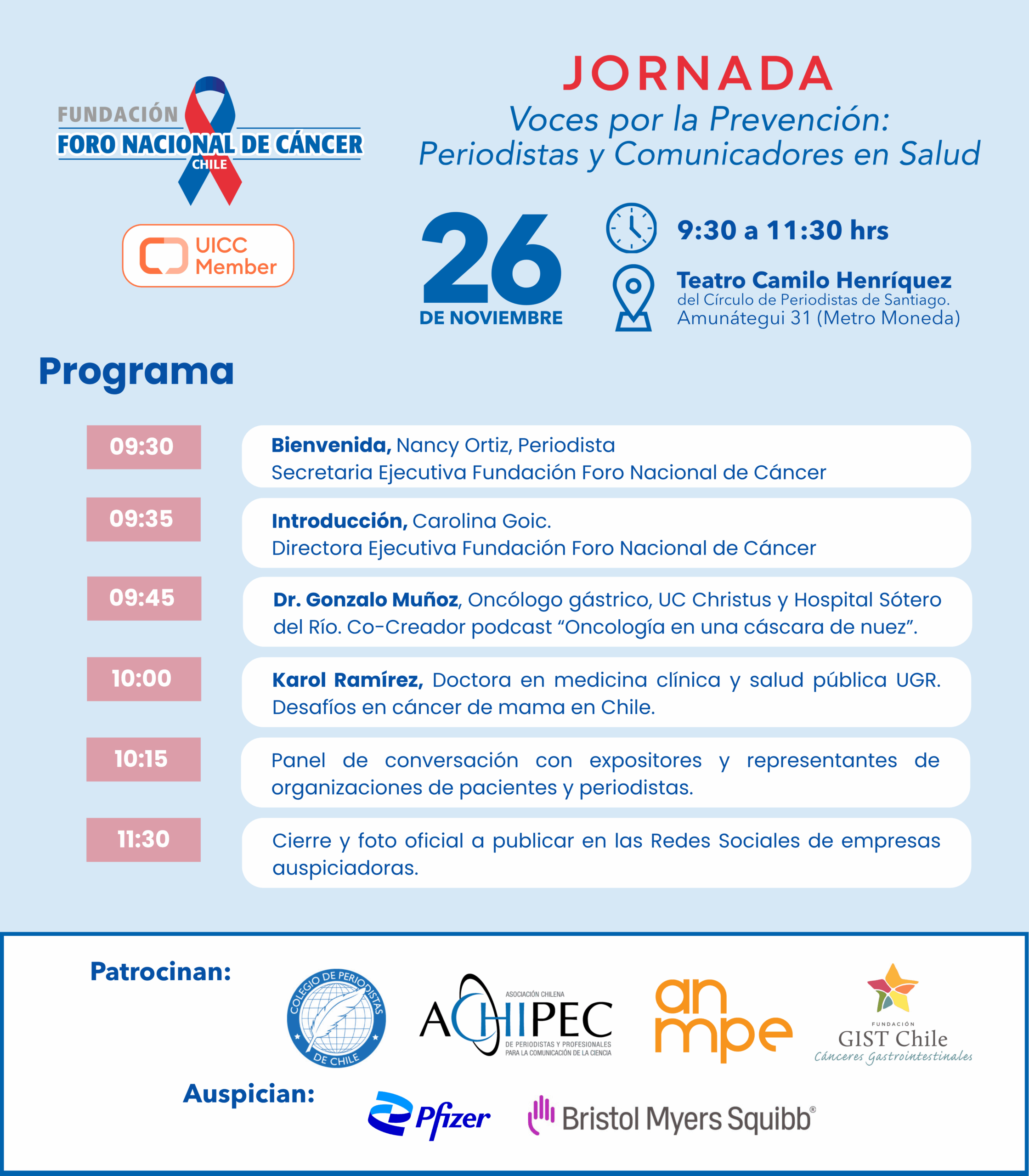 La jornada tendrá lugar en el Teatro Camilo Henríquez, ubicado en Amunátegui 31 Metro Moneda, desde las 9:30 hasta las 11:30 horas. Se invita a las y los profesionales a sumarse para internalizar las bases de la enfermedad, la tecnología y la innovación en el área de la salud, y así entregar información veraz y oportuna a la ciudadanía.